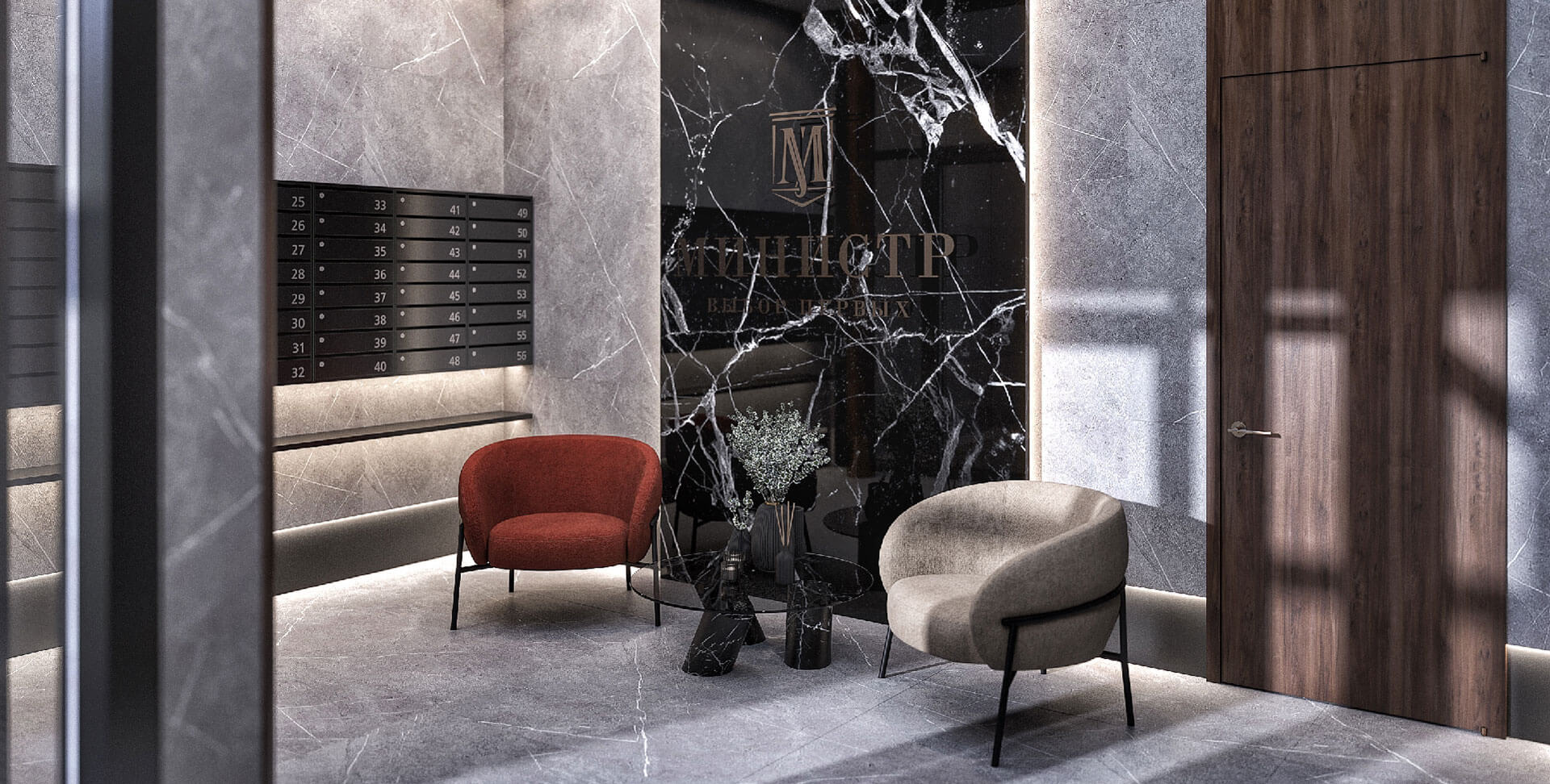 Органичный набор светлых тонов подчеркивает статус дома «Министр». И вместе с тем он не лишен уюта: пространство разделено но комфортные зоны, здесь можно отдохнуть, ожидая лифта или подписать документы курьеру, сидя за столом.